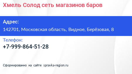 Хмель & Солод, сеть магазинов-баров по адресу 142701, Московская область, Видное, Берёзовая, 8 в дальнейшем Организация, размещена в следующих категориях: