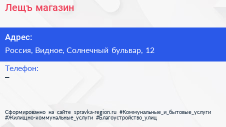 Лещъ, магазин по адресу 12, Солнечный бульвар, Жилой комплекс «Государев дом», Лопатино, Ленинский городской округ, Московская область, Центральный федеральный округ, 142710, Россия в дальнейшем Организация, размещена в следующих категориях: