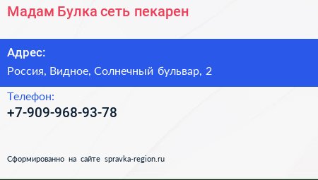 Мадам Булка, сеть пекарен по адресу 2, Солнечный бульвар, Жилой комплекс «Государев дом», Лопатино, Ленинский городской округ, Московская область, Центральный федеральный округ, 142710, Россия в дальнейшем Организация, размещена в следующих категориях: