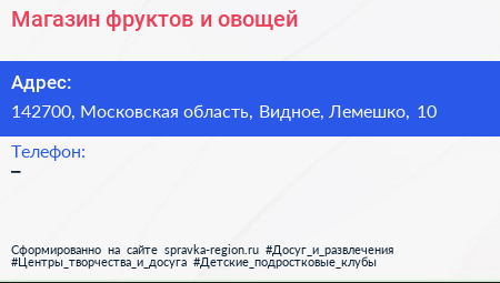 Магазин фруктов и овощей по адресу 142700, Московская область, Видное, Лемешко, 10 в дальнейшем Организация, размещена в следующих категориях: