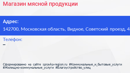 Магазин мясной продукции по адресу 142700, Московская область, Видное, Советский проезд, 4 в дальнейшем Организация, размещена в следующих категориях: