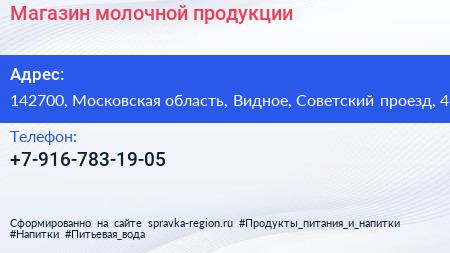 Магазин молочной продукции по адресу 142700, Московская область, Видное, Советский проезд, 4 в дальнейшем Организация, размещена в следующих категориях: