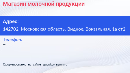 Магазин молочной продукции по адресу 142702, Московская область, Видное, Вокзальная, 1а ст2 в дальнейшем Организация, размещена в следующих категориях: