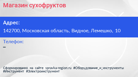 Магазин сухофруктов по адресу 142700, Московская область, Видное, Лемешко, 10 в дальнейшем Организация, размещена в следующих категориях: