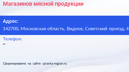 Магазинов мясной продукции по адресу 142700, Московская область, Видное, Советский проезд, 4 в дальнейшем Организация, размещена в следующих категориях: