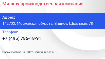 Милкоу, производственная компания по адресу 142703, Московская область, Видное, Школьная, 78 в дальнейшем Организация, размещена в следующих категориях: