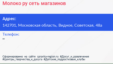 Молоко.ру, сеть магазинов по адресу 142701, Московская область, Видное, Советская, 48а в дальнейшем Организация, размещена в следующих категориях: