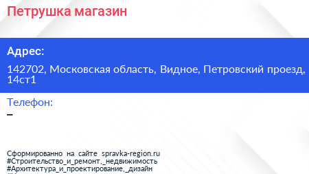 Петрушка, магазин по адресу 142702, Московская область, Видное, Петровский проезд, 14ст1 в дальнейшем Организация, размещена в следующих категориях: