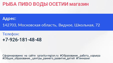 РЫБА & ПИВО ВОДЫ ОСЕТИИ, магазин по адресу 142703, Московская область, Видное, Школьная, 72 в дальнейшем Организация, размещена в следующих категориях:
