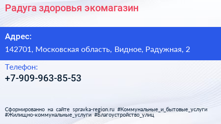 Радуга здоровья, экомагазин по адресу 142701, Московская область, Видное, Радужная, 2 в дальнейшем Организация, размещена в следующих категориях: