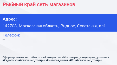 Рыбный край, сеть магазинов по адресу 142703, Московская область, Видное, Советская, вл1 в дальнейшем Организация, размещена в следующих категориях: