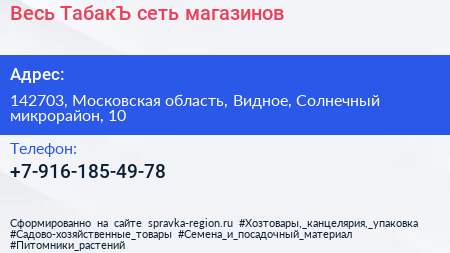 Весь ТабакЪ, сеть магазинов по адресу 142703, Московская область, Видное, Солнечный микрорайон, 10 в дальнейшем Организация, размещена в следующих категориях: