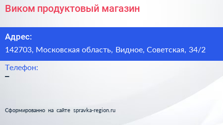 Виком, продуктовый магазин по адресу 142703, Московская область, Видное, Советская, 34/2 в дальнейшем Организация, размещена в следующих категориях: