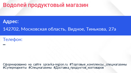 Водолей, продуктовый магазин по адресу 142702, Московская область, Видное, Тинькова, 27а в дальнейшем Организация, размещена в следующих категориях: