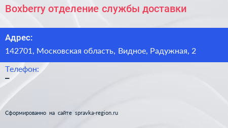 Boxberry, отделение службы доставки по адресу 142701, Московская область, Видное, Радужная, 2 в дальнейшем Организация, размещена в следующих категориях: