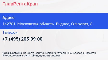 ГлавРентаКран по адресу 142701, Московская область, Видное, Ольховая, 8 в дальнейшем Организация, размещена в следующих категориях: