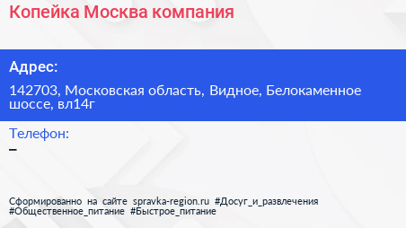 Копейка-Москва, компания по адресу 142703, Московская область, Видное, Белокаменное шоссе, вл14г в дальнейшем Организация, размещена в следующих категориях: