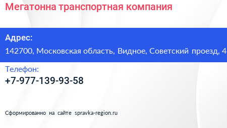 Мегатонна, транспортная компания по адресу 142700, Московская область, Видное, Советский проезд, 4 в дальнейшем Организация, размещена в следующих категориях: