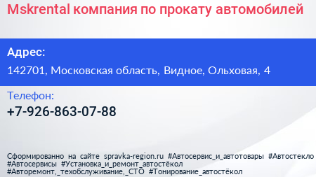 Mskrental, компания по прокату автомобилей по адресу 142701, Московская область, Видное, Ольховая, 4 в дальнейшем Организация, размещена в следующих категориях: