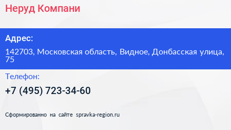 Неруд Компани по адресу 142703, Московская область, Видное, Донбасская улица, 75 в дальнейшем Организация, размещена в следующих категориях: