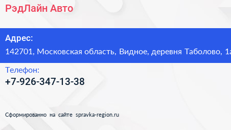 РэдЛайн-Авто по адресу 142701, Московская область, Видное, деревня Таболово, 1а в дальнейшем Организация, размещена в следующих категориях: