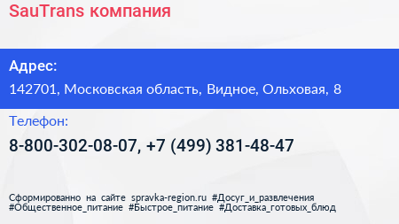 SauTrans, компания по адресу 142701, Московская область, Видное, Ольховая, 8 в дальнейшем Организация, размещена в следующих категориях: