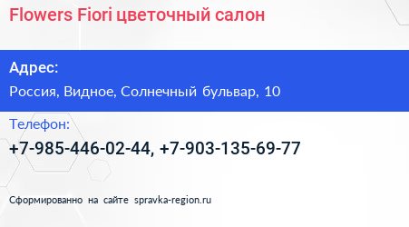 Flowers Fiori, цветочный салон по адресу 10, Солнечный бульвар, Жилой комплекс «Государев дом», Лопатино, Ленинский городской округ, Московская область, Центральный федеральный округ, 142710, Россия в дальнейшем Организация, размещена в следующих категориях: