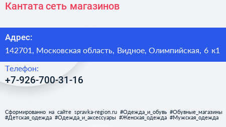 Кантата, сеть магазинов по адресу 142701, Московская область, Видное, Олимпийская, 6 к1 в дальнейшем Организация, размещена в следующих категориях: