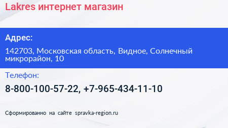 Lakres, интернет-магазин по адресу 142703, Московская область, Видное, Солнечный микрорайон, 10 в дальнейшем Организация, размещена в следующих категориях: