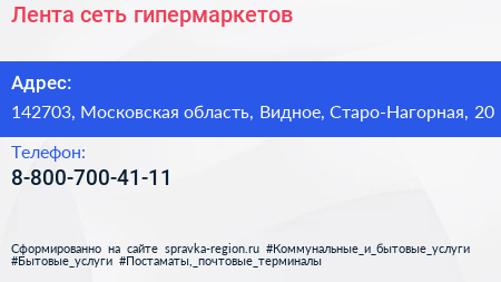 Лента, сеть гипермаркетов по адресу 142703, Московская область, Видное, Старо-Нагорная, 20 в дальнейшем Организация, размещена в следующих категориях: