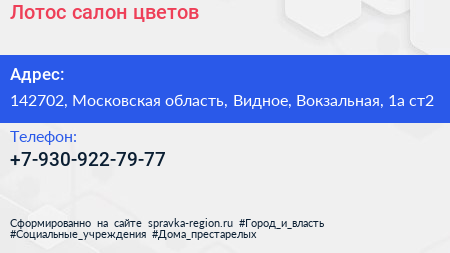 Лотос, салон цветов по адресу 142702, Московская область, Видное, Вокзальная, 1а ст2 в дальнейшем Организация, размещена в следующих категориях: