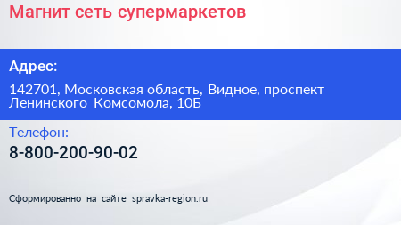 Магнит, сеть супермаркетов по адресу 142701, Московская область, Видное, проспект Ленинского Комсомола, 10Б в дальнейшем Организация, размещена в следующих категориях: