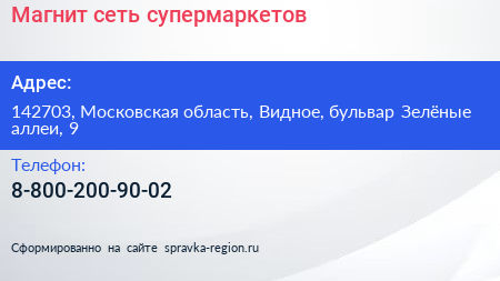 Магнит, сеть супермаркетов по адресу 142703, Московская область, Видное, бульвар Зелёные аллеи, 9 в дальнейшем Организация, размещена в следующих категориях: