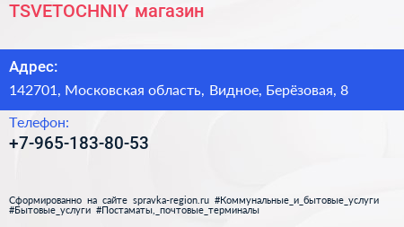 TSVETOCHNIY, магазин по адресу 142701, Московская область, Видное, Берёзовая, 8 в дальнейшем Организация, размещена в следующих категориях: