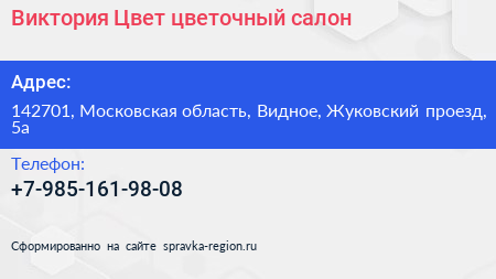 Виктория Цвет, цветочный салон по адресу 142701, Московская область, Видное, Жуковский проезд, 5а в дальнейшем Организация, размещена в следующих категориях: