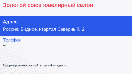 Золотой союз, ювелирный салон по адресу Торговый центр "ЭкоВидное", 2, квартал Северный, микрорайон Купелинка, 6-й микрорайон, Ленинский городской округ, Московская область, Центральный федеральный округ, 152701, Россия в дальнейшем Организация, размещена в следующих категориях: