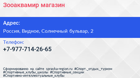 Зооаквамир, магазин по адресу 2, Солнечный бульвар, Жилой комплекс «Государев дом», Лопатино, Ленинский городской округ, Московская область, Центральный федеральный округ, 142710, Россия в дальнейшем Организация, размещена в следующих категориях: