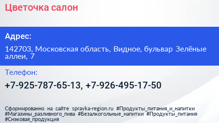Цветочка, салон по адресу 142703, Московская область, Видное, бульвар Зелёные аллеи, 7 в дальнейшем Организация, размещена в следующих категориях: