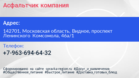 Асфальтчик, компания по адресу 142701, Московская область, Видное, проспект Ленинского Комсомола, 46а/1 в дальнейшем Организация, размещена в следующих категориях: