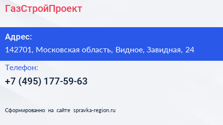 ГазСтройПроект по адресу 142701, Московская область, Видное, Завидная, 24 в дальнейшем Организация, размещена в следующих категориях: