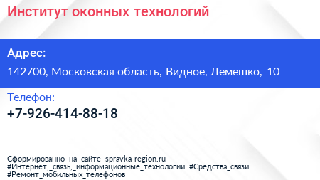 Институт оконных технологий по адресу 142700, Московская область, Видное, Лемешко, 10 в дальнейшем Организация, размещена в следующих категориях: