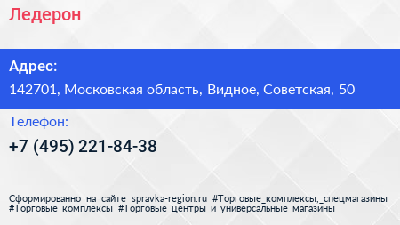 Ледерон по адресу 142701, Московская область, Видное, Советская, 50 в дальнейшем Организация, размещена в следующих категориях: