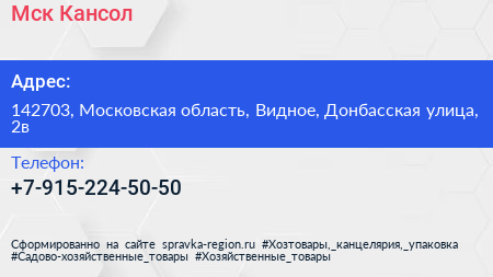 Мск-Кансол по адресу 142703, Московская область, Видное, Донбасская улица, 2в в дальнейшем Организация, размещена в следующих категориях: