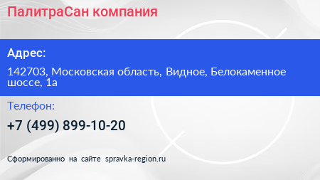 ПалитраСан, компания по адресу 142703, Московская область, Видное, Белокаменное шоссе, 1а в дальнейшем Организация, размещена в следующих категориях: