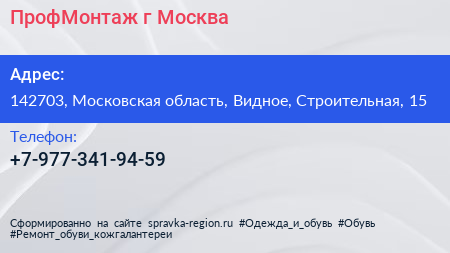 ПрофМонтаж, г. Москва по адресу 142703, Московская область, Видное, Строительная, 15 в дальнейшем Организация, размещена в следующих категориях: