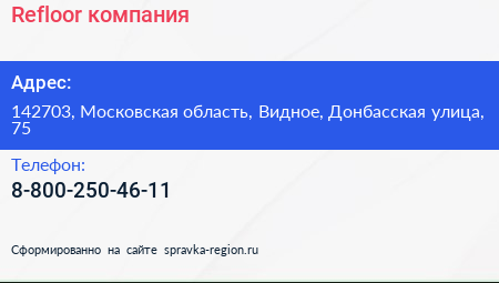 Refloor, компания по адресу 142703, Московская область, Видное, Донбасская улица, 75 в дальнейшем Организация, размещена в следующих категориях: