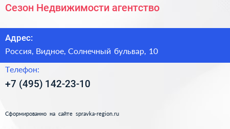 Сезон Недвижимости, агентство по адресу Ароматный мир, 10, Солнечный бульвар, Жилой комплекс «Государев дом», Лопатино, Ленинский городской округ, Московская область, Центральный федеральный округ, 142710, Россия в дальнейшем Организация, размещена в следующих категориях:
