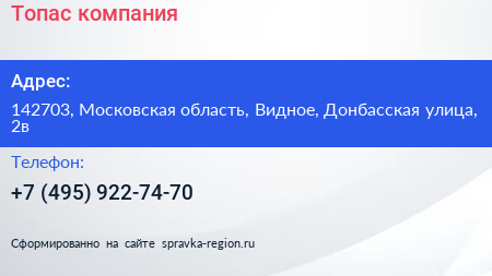Топас, компания по адресу 142703, Московская область, Видное, Донбасская улица, 2в в дальнейшем Организация, размещена в следующих категориях: