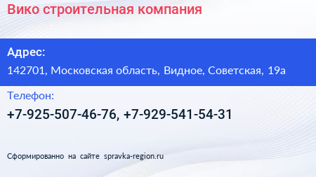 Вико, строительная компания по адресу 142701, Московская область, Видное, Советская, 19а в дальнейшем Организация, размещена в следующих категориях: