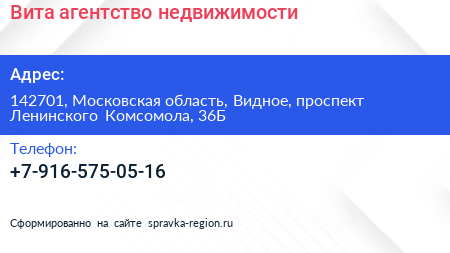 Вита, агентство недвижимости по адресу 142701, Московская область, Видное, проспект Ленинского Комсомола, 36Б в дальнейшем Организация, размещена в следующих категориях: